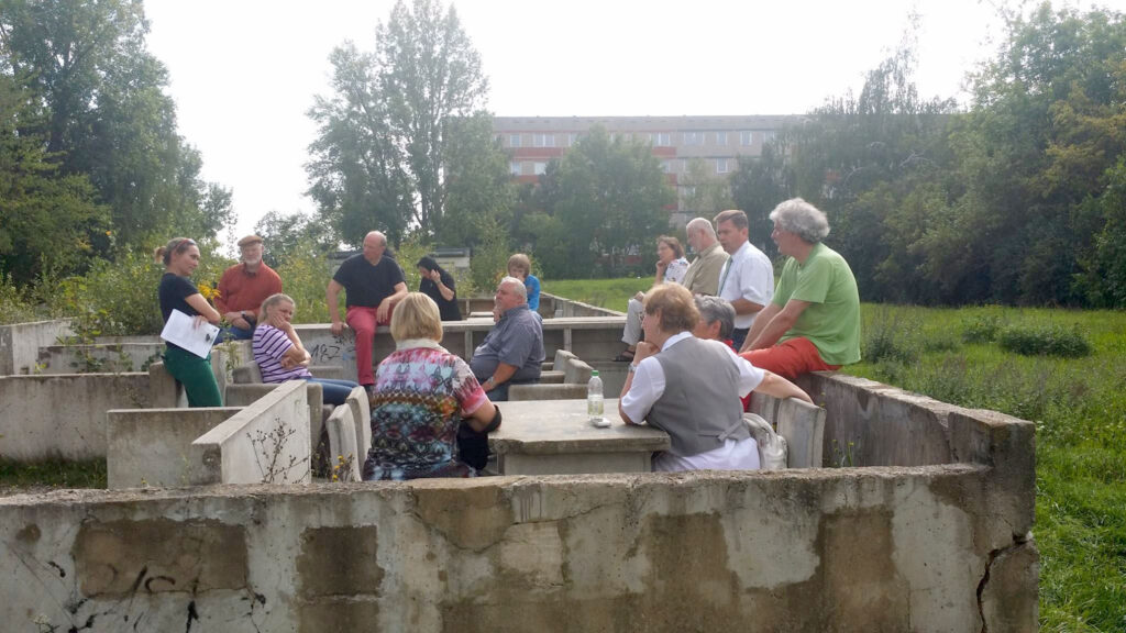 Die Grabungsstaedte lässt viele Sichtweisen und Handlungsräume zu: sie einfach wie eine Bühne zu benutzen, Fragen nach privatem und öffentlichem Raum zu stellen oder Gedanken zu Geschichte, historischem Gedächtnis und Vergänglichkeit zu entwickeln. Sind die anfänglichen Vorstellungen zum Umgang mit der Arbeit eingetroffen? Wie dauerhaft ist Beton? Die Silberhöhe hat sich geändert – das Kunstwerk auch? Diesen und anderen Fragen stellen sich Frank Sydow, Vorstand der Wohnungsgenossenschaft Frohe Zukunft e.G., der Kunstwissenschaftler Dr. Johannes Stahl, die Künstlerin Dagmar Schmidt und die Öffentlichkeit am 13. September 2015 ab 14 Uhr in der Grabungsstaedte. Gedanklich, bildlich und praktisch umkreist das Gespräch Wirklichkeiten und Möglichkeiten von Kunst im öffentlichen Raum.